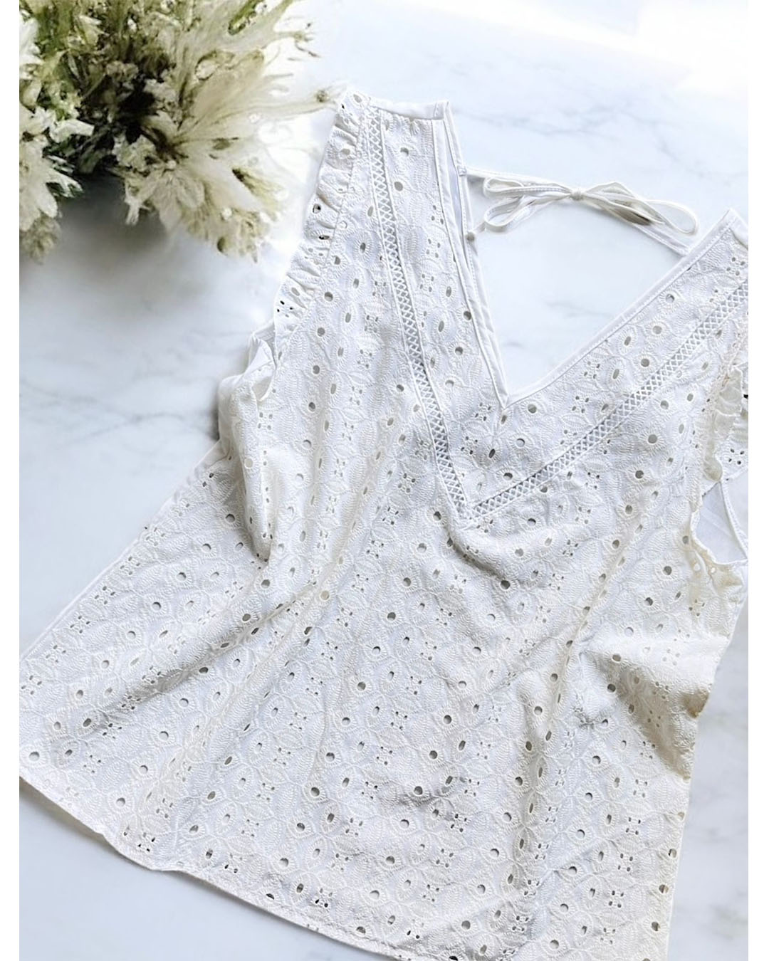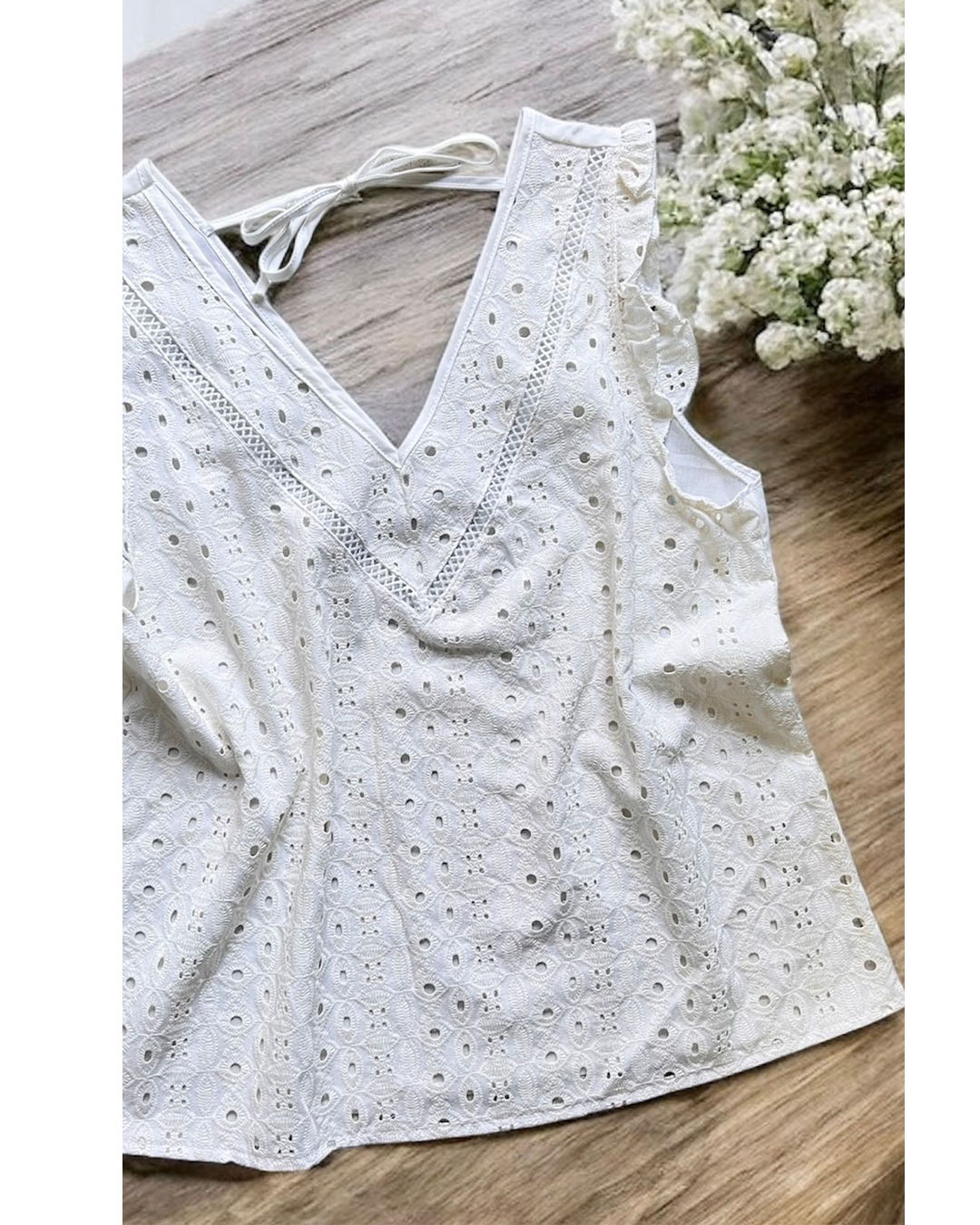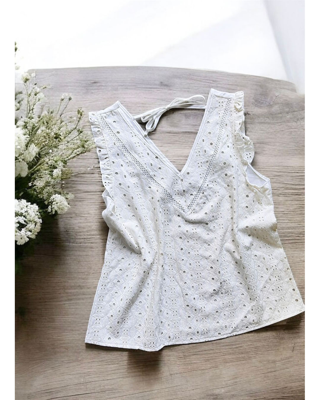 – Blusa escote en V con puntilla, volado y tira en espalda
