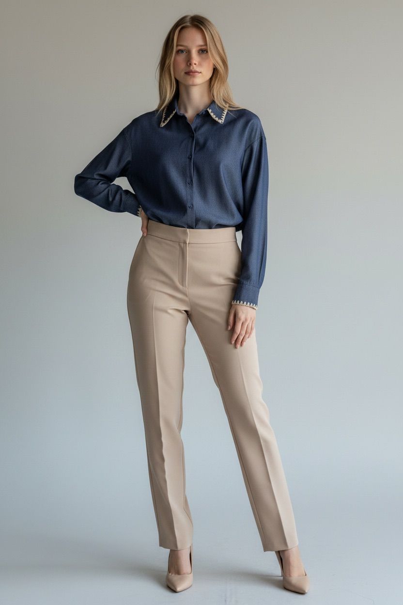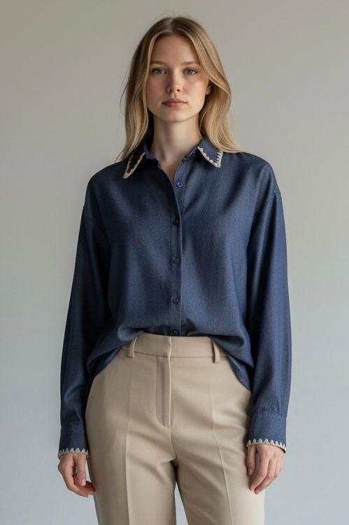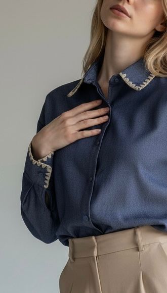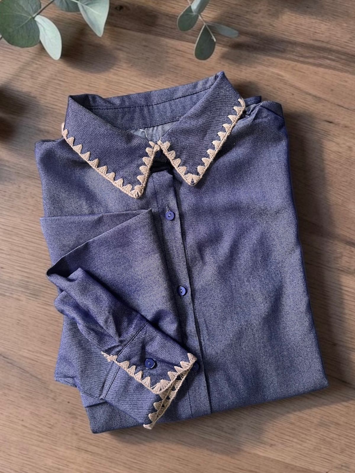 – Camisa de denim liviano con detalles bordados en cuello y puños.