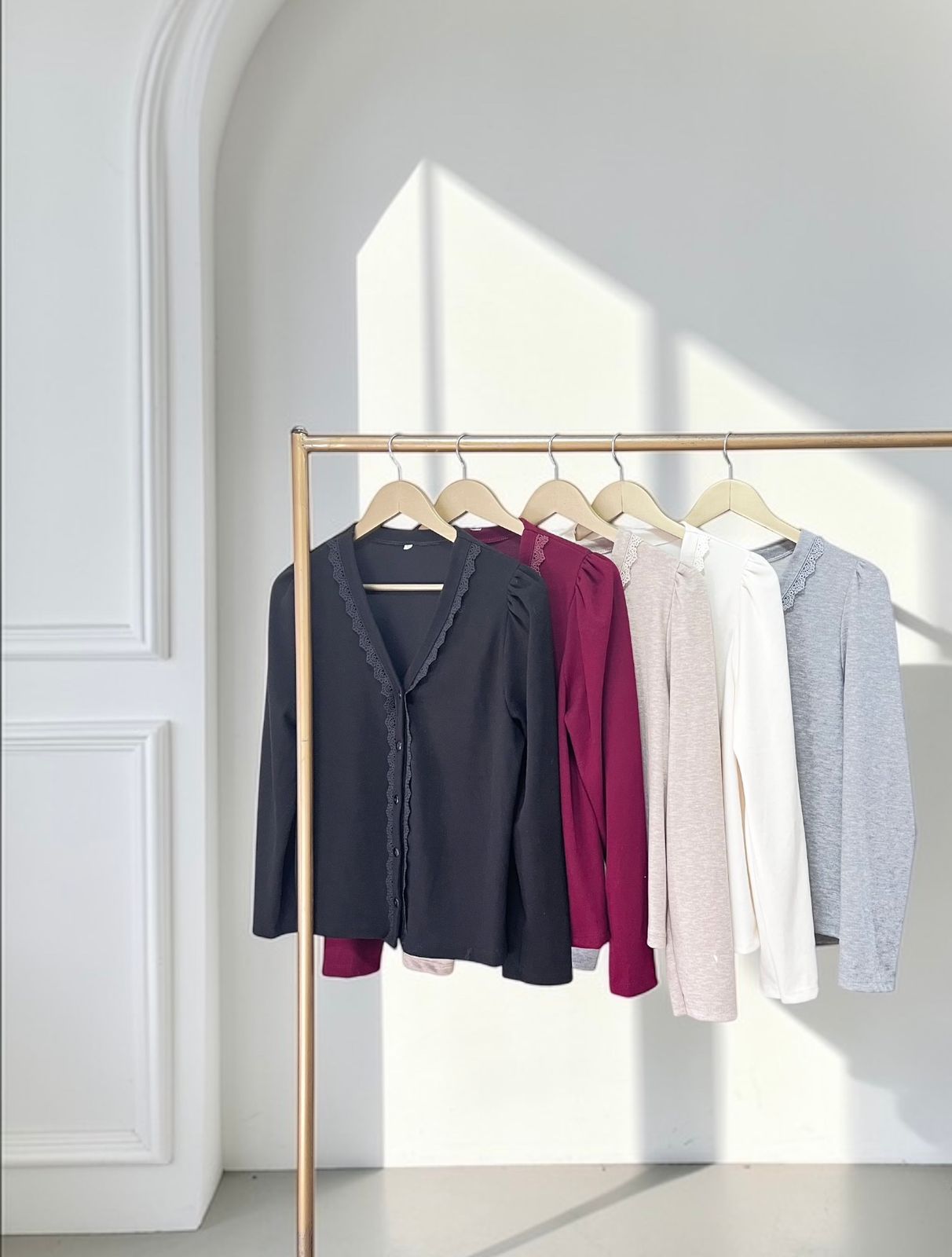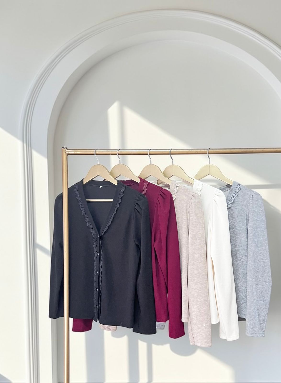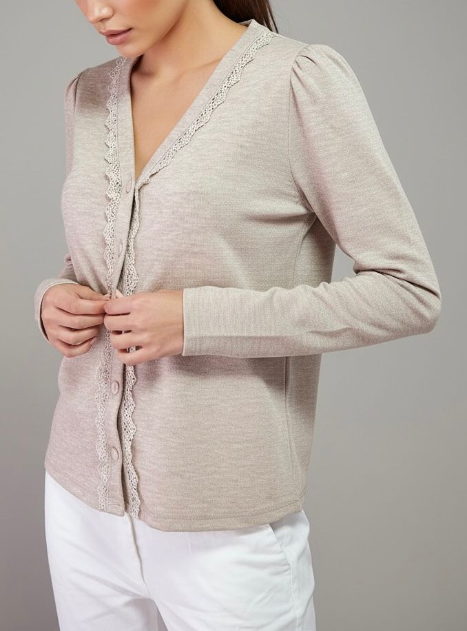 – Saco con escote en V con terminaciones de puntilla calada con leve frunce en los hombros