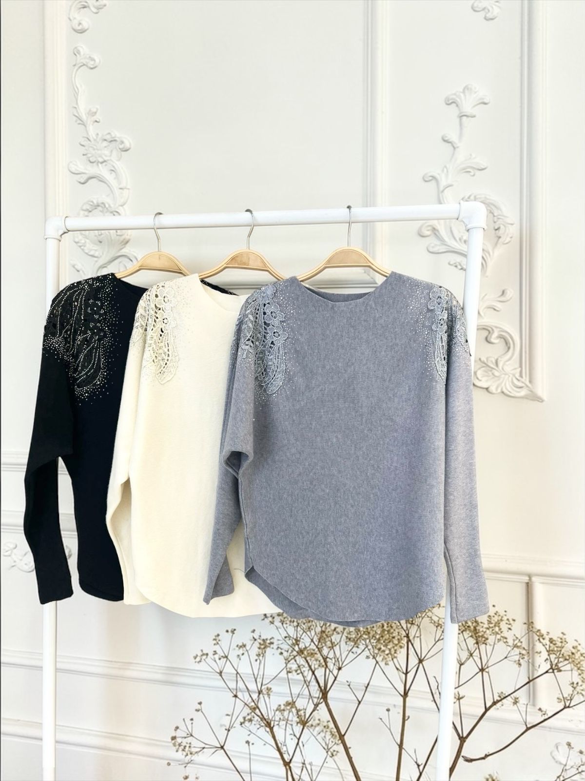 – Sweater con detalles de encaje y pedrería brillosa