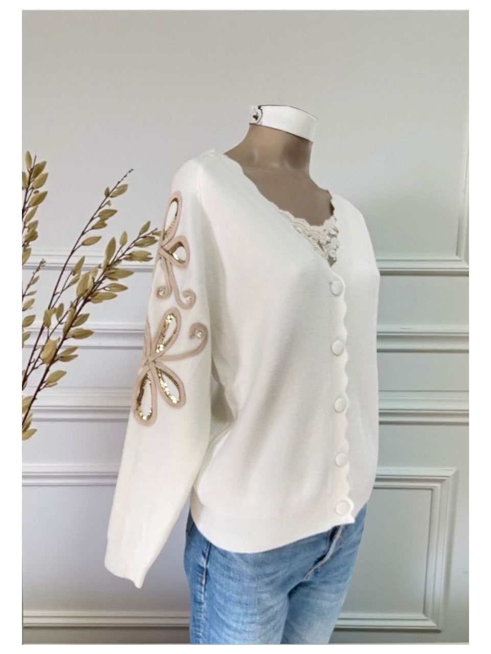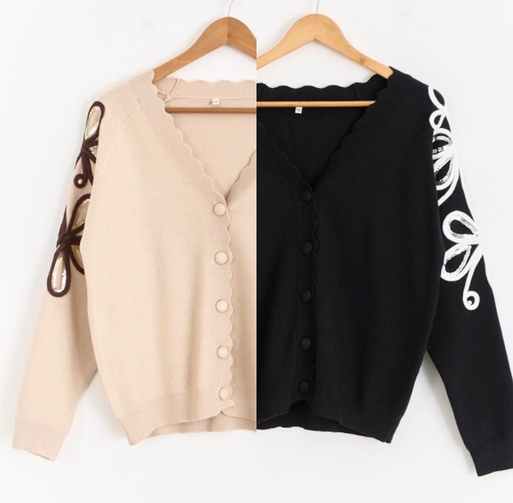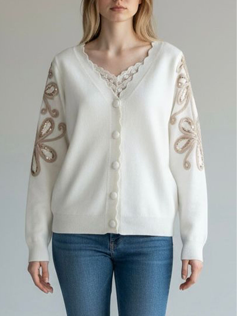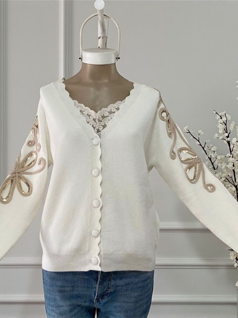 – Cardigan con escote en V, botones forrados y apliques en las mangas