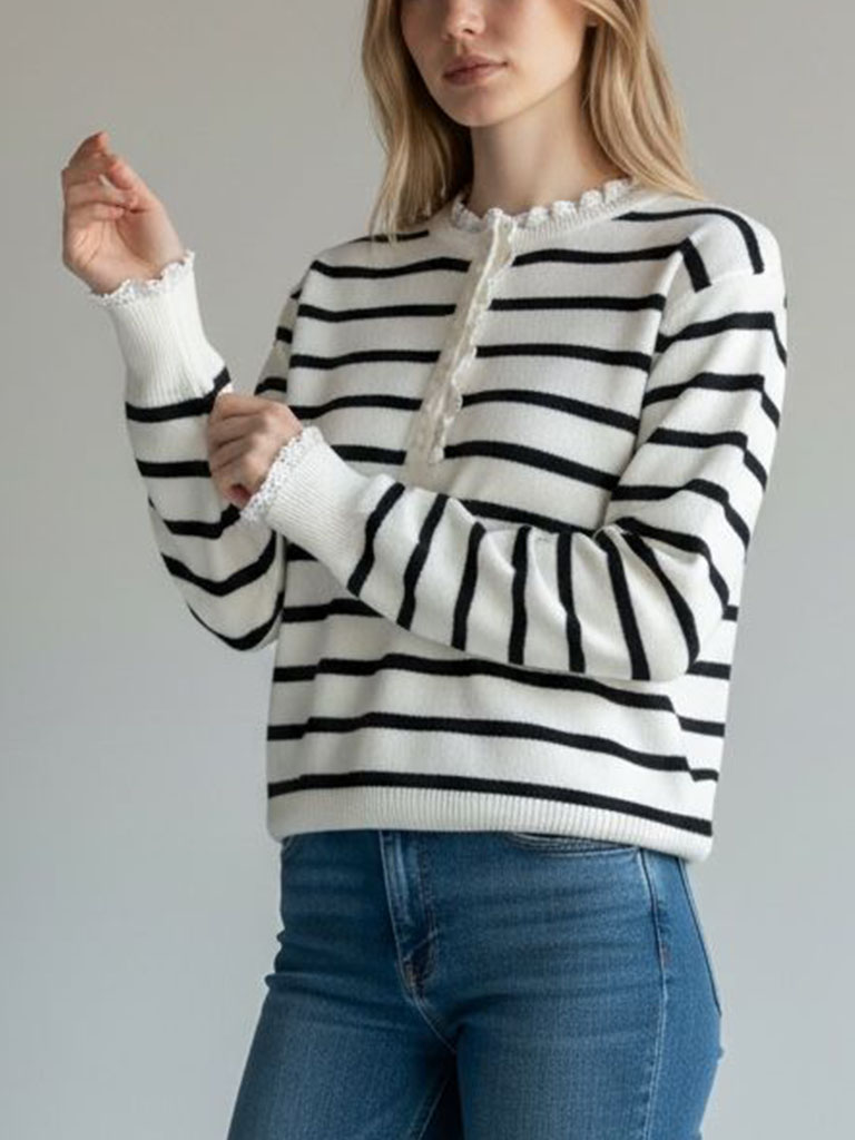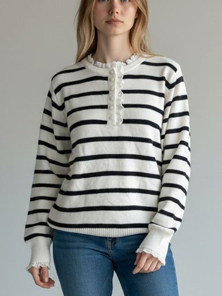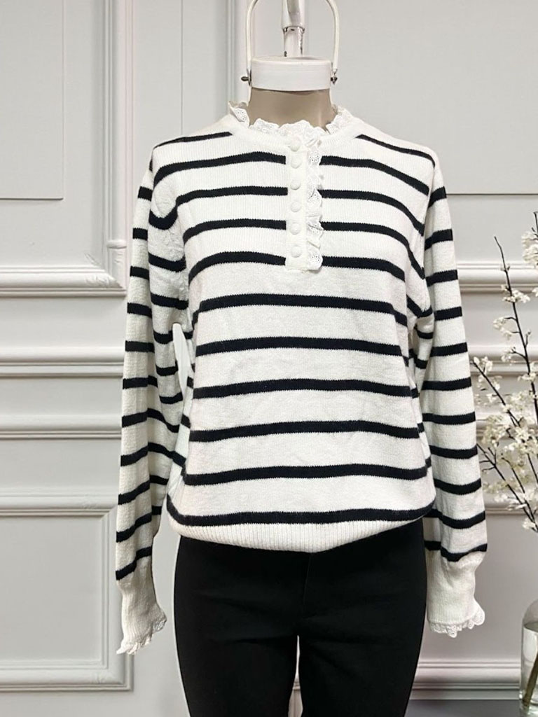 – Sweater rayado con volados en el cuello, cartera con botones y mangas con terminación en volado