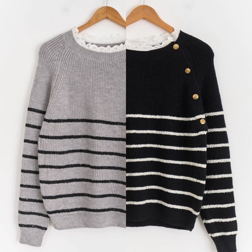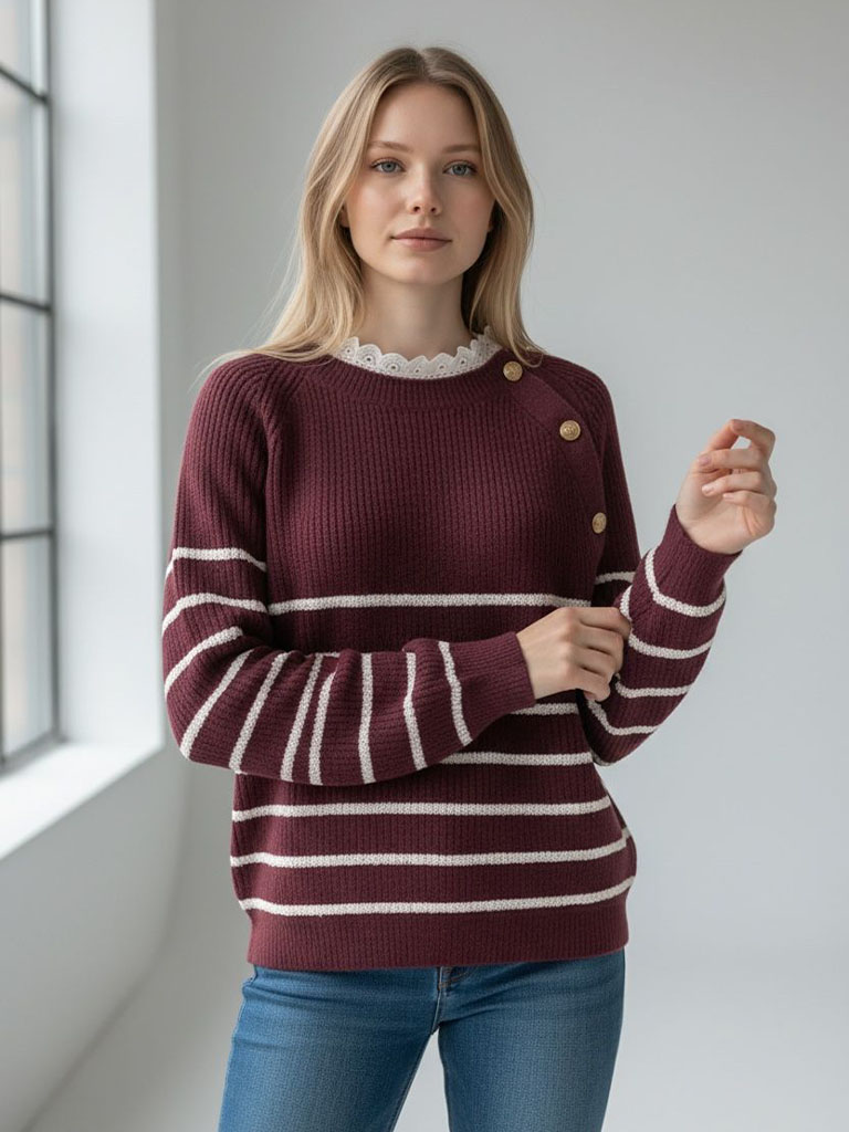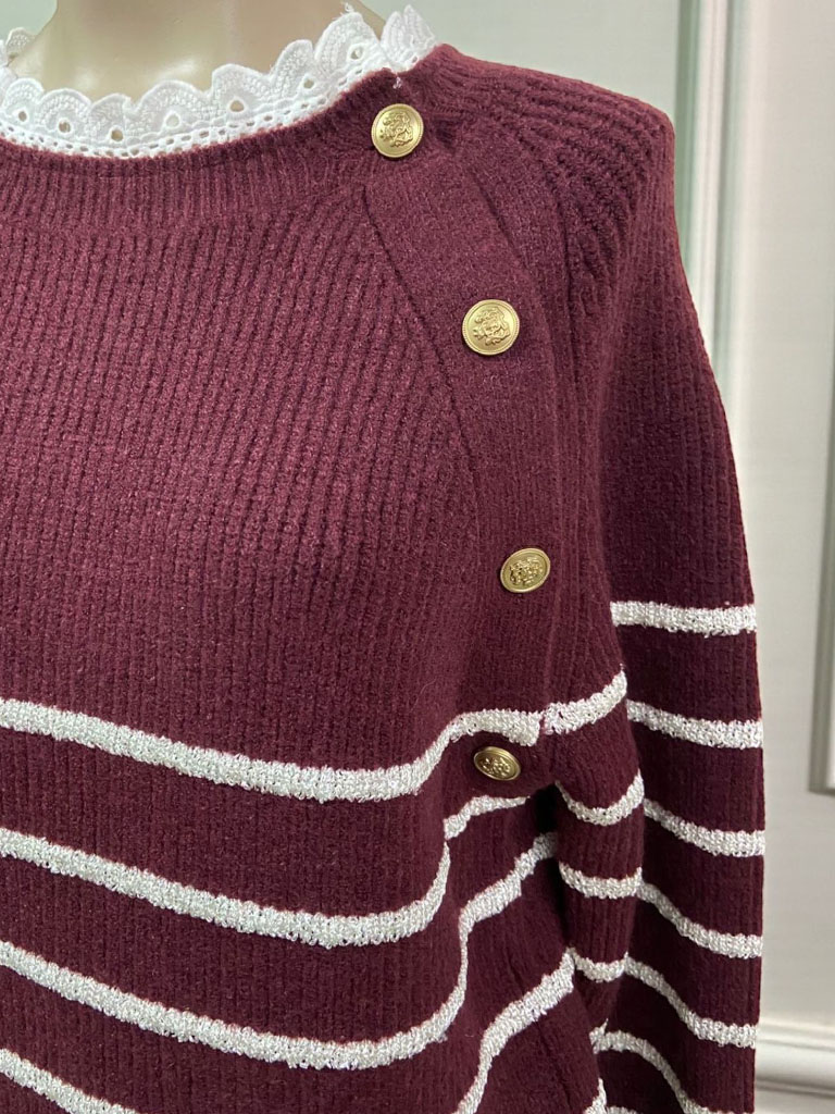 – Sweater rayado con cuello redondo con puntilla y botones dorados